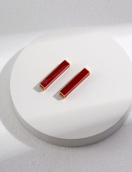 Minimalist Gold Geometric Drop Earrings with Red Enamel Bar and Zircon Accent