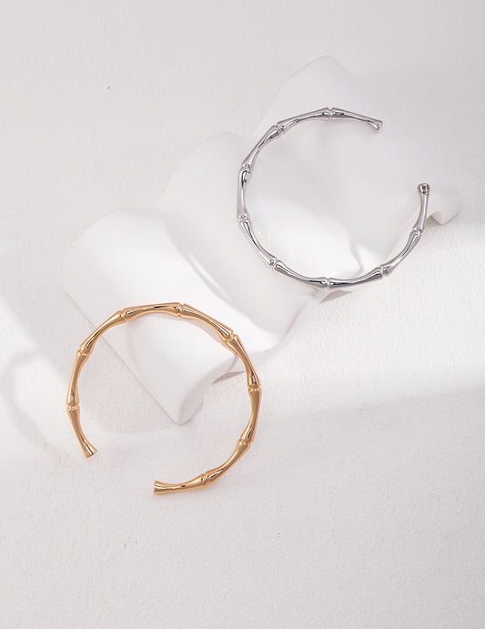 • Bamboo texture open cuff bracelet in 18K gold plated 925 sterling silver on a white background