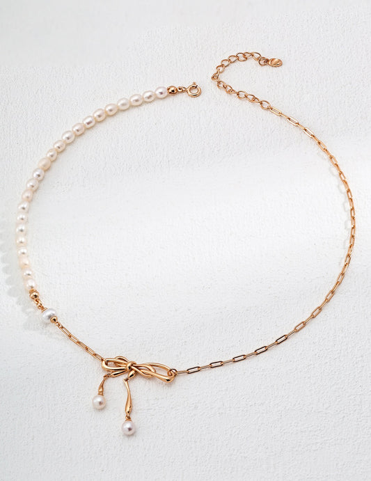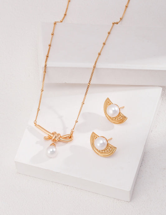 • 18K gold plated 925 silver knot necklace with natural pearl pendant on white background