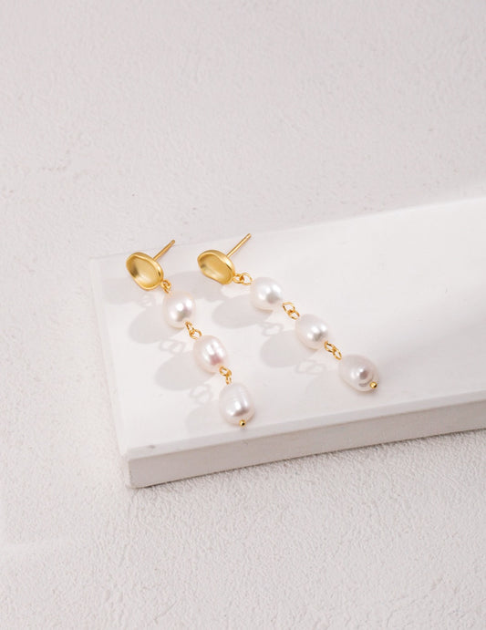 • Elegant 18K gold-plated 925 silver earrings featuring three natural freshwater pearls in a minimalist vertical drop design — timeless dangle jewelry for women